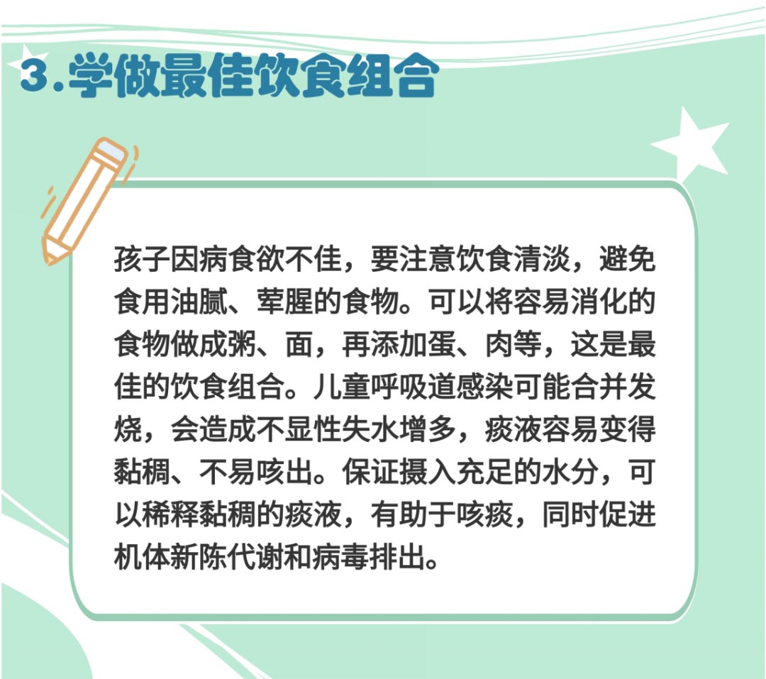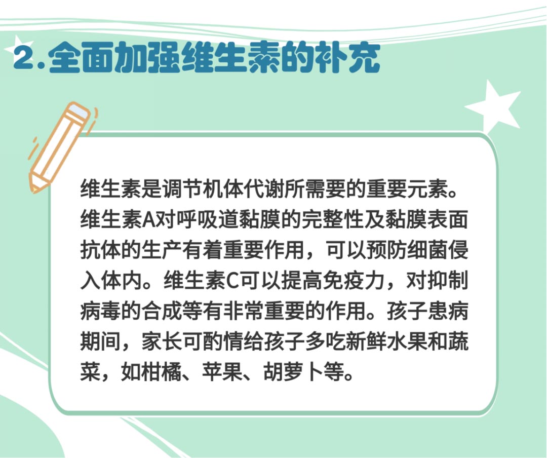 6月龄以内的患儿,建议以哺乳为主,可适当喝点水。年龄稍大的儿童,多吃富含优质蛋白质的食物,同时要全面加强维生素的补充,多吃水果和蔬菜,多饮水,清淡饮食,少吃虾蟹等海鲜,尤其是患有过敏性咳嗽的孩子。