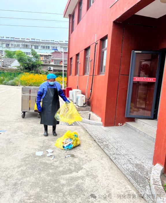 院感科陆科长指导刘洪俊按照处理流程及时采取收集、清理、消毒措施,并将医疗废物用医疗废物专用袋包装并密闭封袋,贴上标识,转运至医疗废物暂存处。